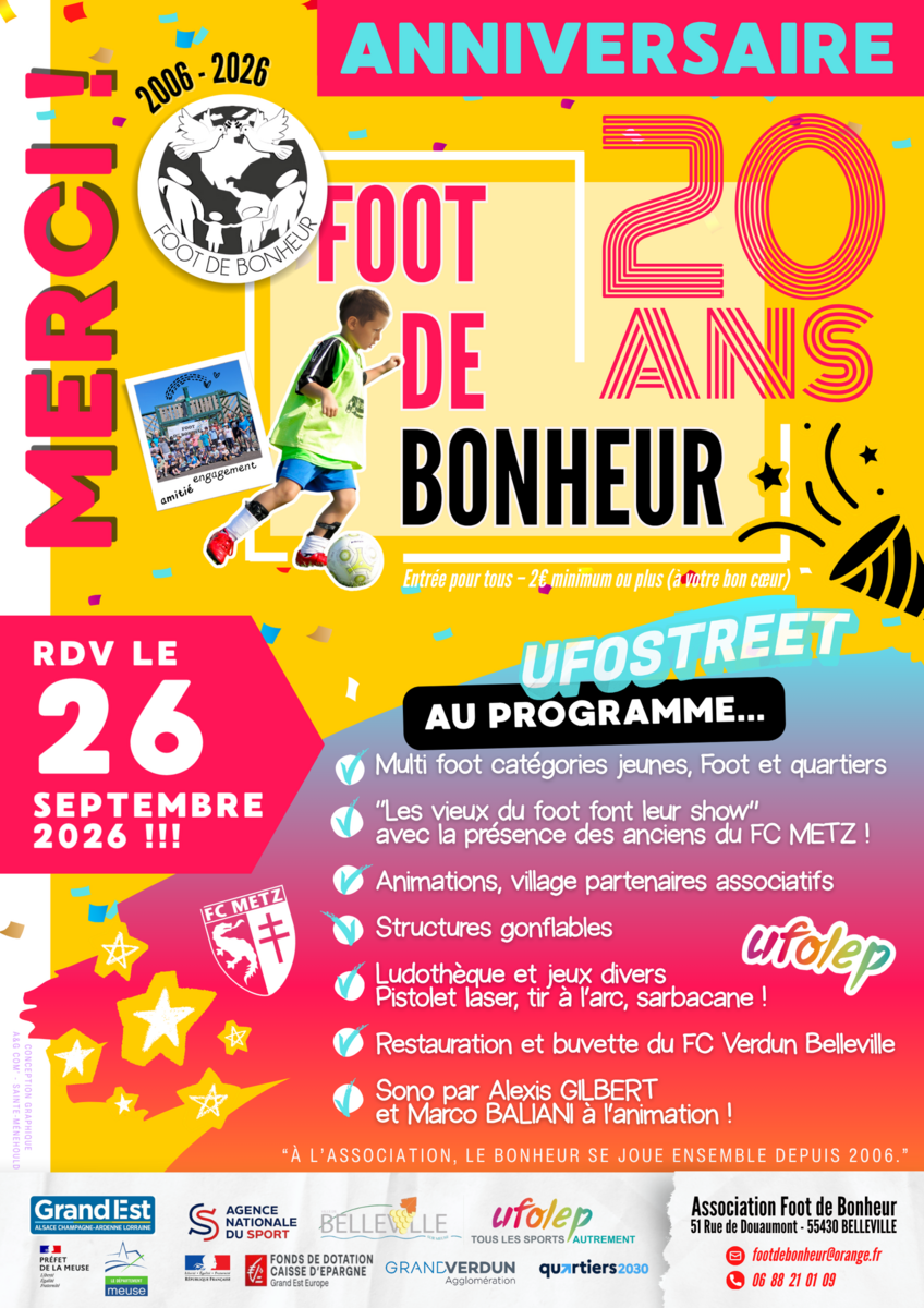 2026 sera l'occasion de fêter les 20 ans de notre association. Tout au long de l'année des évènements viendront émailler et mettre en avant notre parcours associatif qui vise essentiellement des enfants de l'ASE (Aide Sociale à l'Enfance). Un document complet précise le contenu de notre année avec un temps fort sur Verdun les 25 et 26/9/2026.